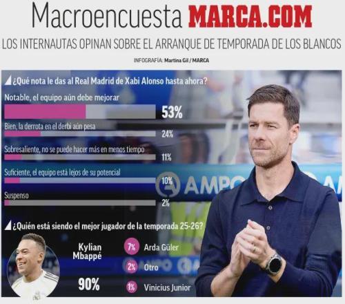 马卡调查球迷对皇马本赛季评价:阿隆索表现出色,姆巴佩最佳