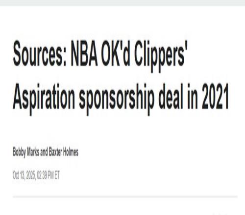北京时间10月14日,ESPN报道,多位消息人士透露,2021年NBA曾对快船队与Aspiration公司的一份3亿美元赞助协议进行审核并批准。数月后,这家公司与球星莱昂纳德签署了一份单独协议,该协议引发了联盟对“工资帽规避”的调查。