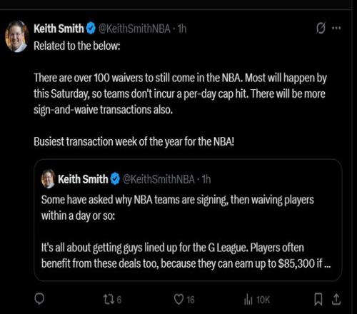 雷速体育10月14日宣 名记Keith Smith更新社交媒体,谈到了为什么NBA球队会在签下球员后一天裁掉他们,并提到了本周将会是NBA最繁忙的交易周,一些非保障合同的球员能否留在球队很快就能得到答案。