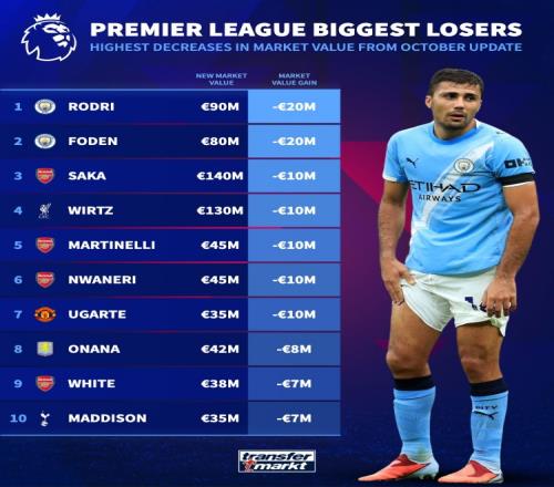 此外,曼联的乌加特、维拉的奥纳纳以及阿森纳的本-怀特和热刺的麦迪逊也加入了跌幅榜,分别降了1000万欧元和700万欧元不等。尤其是奥纳纳,尽管他的身价降幅达到800万欧元,但目前仍保持在4200万欧元的位置。