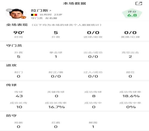 雷速体育10月20日宣 在今天凌晨结束的英超双红会中,曼联门将拉门斯表现出色,帮助曼联客场力克卫冕冠军利物浦。