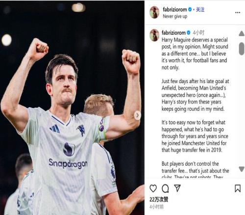 雷速体育10月22日宣 今天著名转会记者罗马诺在社媒发表长文,谈到了曼联中后卫马奎尔。罗马诺对马奎尔大加赞扬,表示马奎尔虽然一直遭遇谩骂等不公正对待,但他始终保持平和,坚持不懈,努力追求梦想,为球队奉献自己的一切。