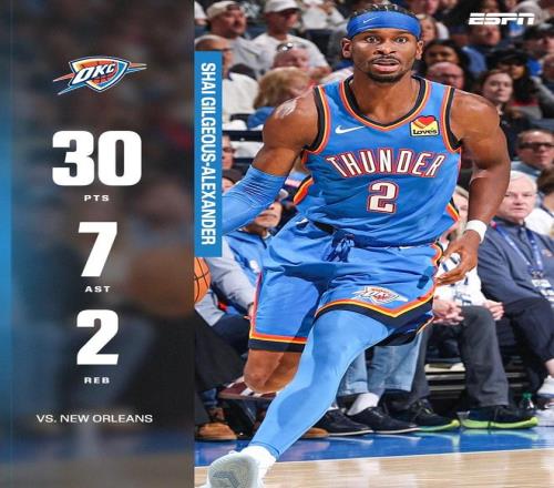 北京时间今日,在NBA常规赛中,俄克拉荷马雷霆队在主场以137-106大胜新奥尔良鹈鹕队,取得了开季七连胜。