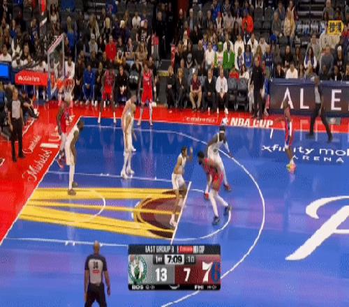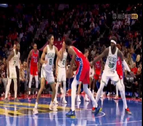 打凯尔特人,恩比德命中了一个平平无奇中距离且造成了对手犯规