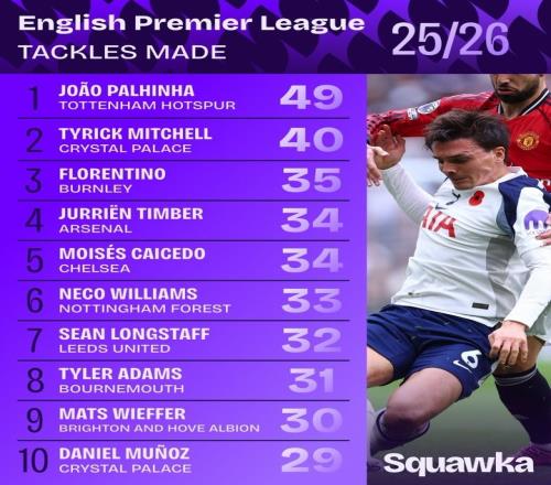 11月11日宣 至今英超联赛已进行11轮,本赛季的抢断数据也随之出炉。据统计,来自托特纳姆热刺的若昂·帕利尼亚凭借49次成功抢断位居榜首。他的出色表现使他在防守端发挥了重要的作用。