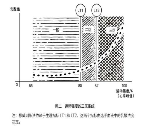 与世界上大多数耐力训练采用的五区划分方式不同,挪威训练法是简单的三区划分,即有氧阈值之下的轻松区、无氧阈值之上的强度区,以及两个阈值之间的混合区(图一)。