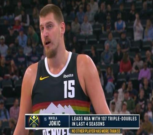 比赛期间,转播方给出一组数据:在过去四个赛季中,约基奇共完成了107次三双,而其他球员最多则不超过55次三双。