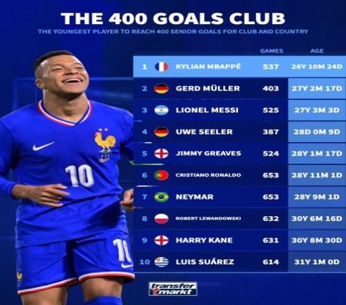 在11月15日的世预赛中,法国天才前锋姆巴佩迎来了职业生涯的一个重要里程碑——他在对阵乌克兰的比赛中打入了职业生涯的第400个进球。这位年轻的球员以26岁10个月24天的年龄,成为历史上最年轻达到这一成就的球员,尽显其在绿茵场上的非凡天赋与潜力。