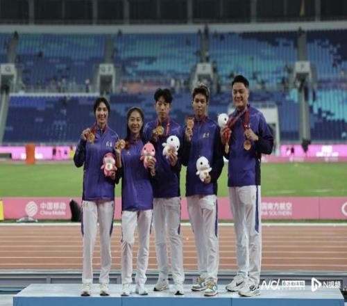 11月16日晚,十五运会田径比赛4×100米混合接力举行颁奖仪式。
