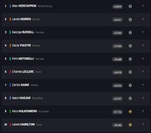 第9圈,维斯塔潘已经将拉塞尔甩出自己的DRS区独占鳌头,诺里斯的速度则越来越慢,已经被拉塞尔拉开到2.7秒左右。车阵中游,汉密尔顿陷入腹背受敌的境地,而“极其凶猛”的勒克莱尔则不断缩小与身前的皮亚斯特里的距离,终于在第13圈和第14圈分别完成了对皮亚斯特里和哈贾尔的超越。