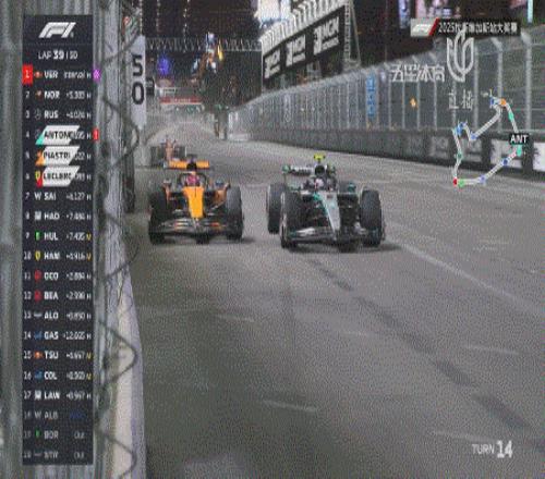 第38圈,由于抢跑将被罚时5秒的安东内利处在第四名的位置,与身后的皮亚斯特里和勒克莱尔组成了“DRS高铁”。这一圈,皮亚斯特里想要在14号弯发起进攻,但搭载36圈硬胎的安东内利强势防守,不给对手任何机会超越自己。