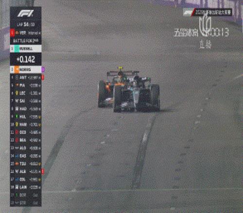 第35圈,诺里斯已经追到拉塞尔身后,在14号弯前利用DRS抽头完成超越。来到第二名之后,他距离身前的维斯塔潘还有5秒不到的差距。