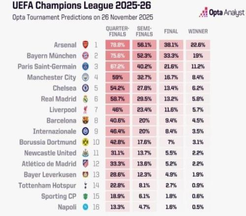 OPTA更新欧冠夺冠概率:阿森纳22.6%居首