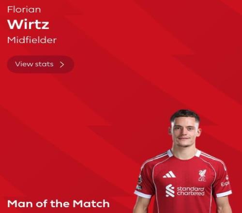 英超第14轮,利物浦主场1-1战平桑德兰,维尔茨当选英超官方全场最佳球员。