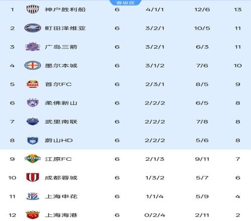 积分榜前列,4支球队积分上双,神户胜利船积13分继续领跑,町田泽维亚、广岛三箭同积11分分列第2和第3,墨尔本城积10分排在第4。4支球队与淘汰区的分差都在3分及以上,基本已经锁定了晋级名额。