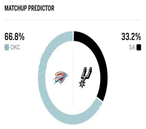 赛前,美媒ESPN对本场比赛进行了胜率预测,马刺队胜率仅有33.2%,依旧不被看好,雷霆队胜率则高达66.8% 。