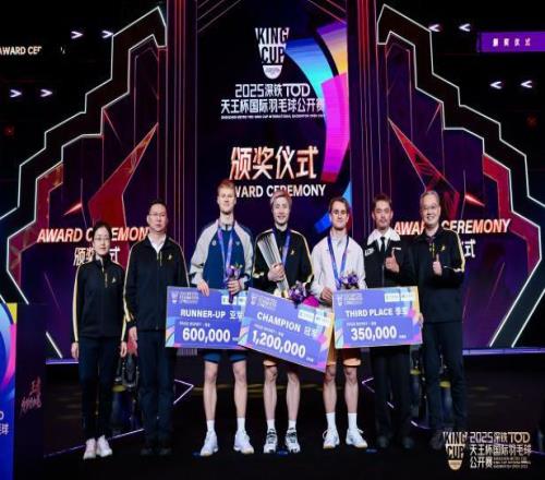 颁奖典礼上,赛事发起人林丹为获奖选手颁奖,冠军石宇奇斩获120万元奖金,亚军安东森获60万元,季军拉尼尔与殿军乔纳坦分别收获35万元、25万元奖金。当林丹将冠军奖杯交到石宇奇手中,全场灯光聚焦,定格下2025天王杯最荣耀的瞬间。