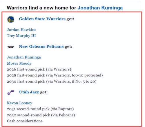 仅一夜,爆勇士三方交易追墨菲!库明加+穆迪搭上3个首轮,值吗