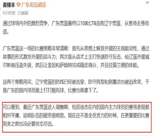 麦记所言非虚,也是相对客观的说出了广东队目前的处境,尽管昨晚广东轻松大胜了辽宁,但其实球队现在还没有达到最佳状态,徐杰和胡明轩其实都比较疲劳,胡明轩膝盖有伤一直是边打边养,徐杰近期也是换上了流感,身体状况比较一般,辽粤战虽然是传统恩怨局,广东队赛前无论是备战还是从球员采访中都能看出他们对这场比赛的重视程度,但理性来说,现在并不是广东队全员发力的时候,毕竟还有2/3的赛程要打,没必要在这种时候发挥出全力,把对手打急眼,以免影响了后续的比赛,您觉得呢?