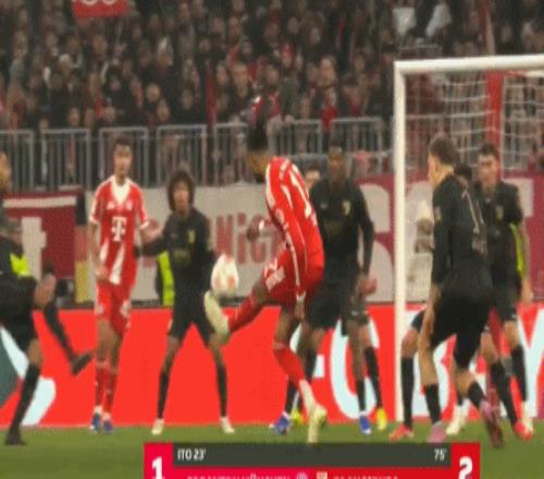 第26分钟,拜仁再次制造威胁,路易斯-迪亚斯接应长传,禁区内摆脱防守,小角度起脚劲射,达门奋力将球扑出。随后的角球攻势,又是奥利塞起球传中,凯恩后点头球击中立柱弹出,不过裁判吹罚金玟哉对门将犯规在先。
