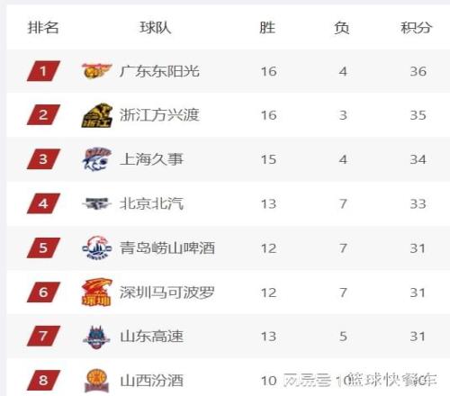 CBA积分榜最新排名出炉!广东逆袭广厦杀回第1:辽篮跌至第15名