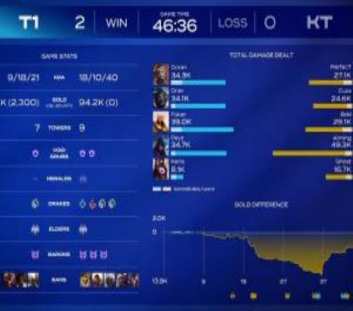 体育资讯01月23日称 T1 2:0 KT,赛后数据面板显示T1在落后13.9k经济差的情况下最终翻盘比赛。