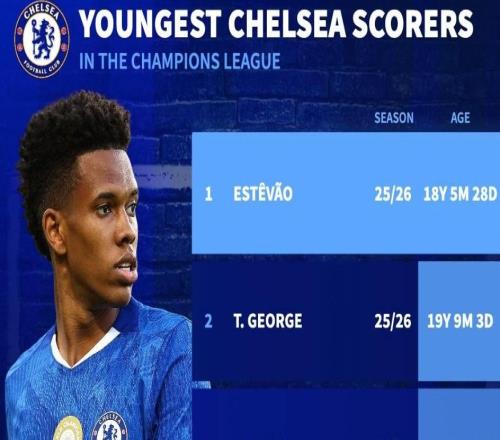 切尔西欧冠最年轻进球者前5:埃斯特旺、乔治、吉乌位居前3位