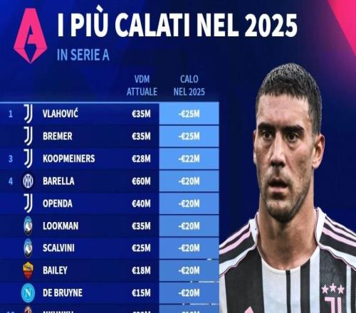 北京时间12月31日,德转列出了意甲2025年球员身价跌幅榜,尤文图斯包揽前三,弗拉霍维奇和布雷默下跌2500万欧元并列第一,库普梅纳斯下跌2200万欧元第三。意甲2025年球员身价跌幅TO