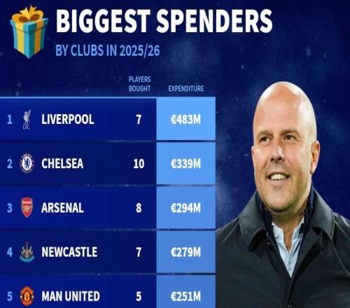 德转列本赛季俱乐部引援支出前10:英超9席,利物浦4.83亿第1