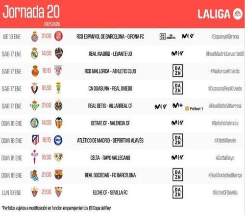 西甲官方公布了第20轮比赛开球时间,皇马vs莱万特将于北京时间1月17日21:00开打,皇家社会vs巴萨将于北京时间1
